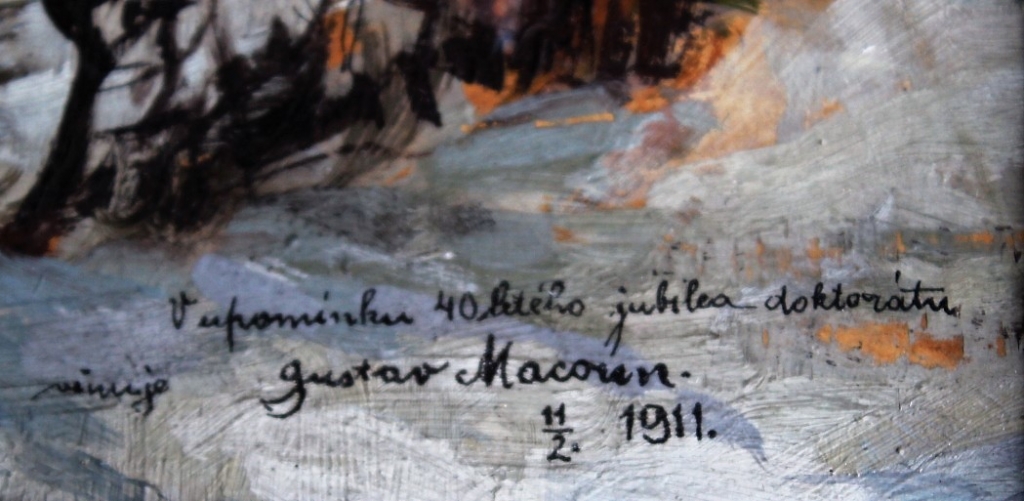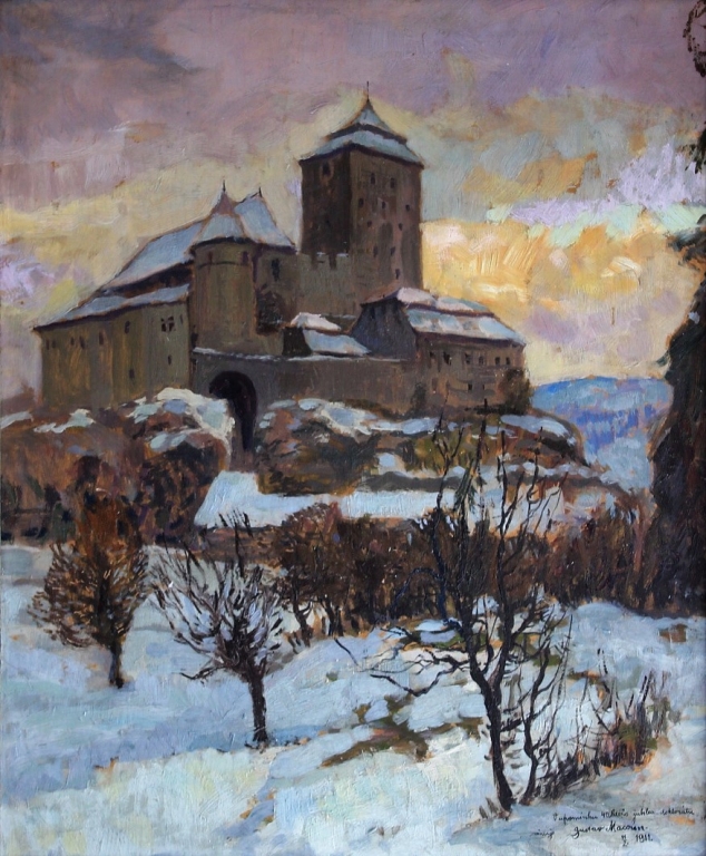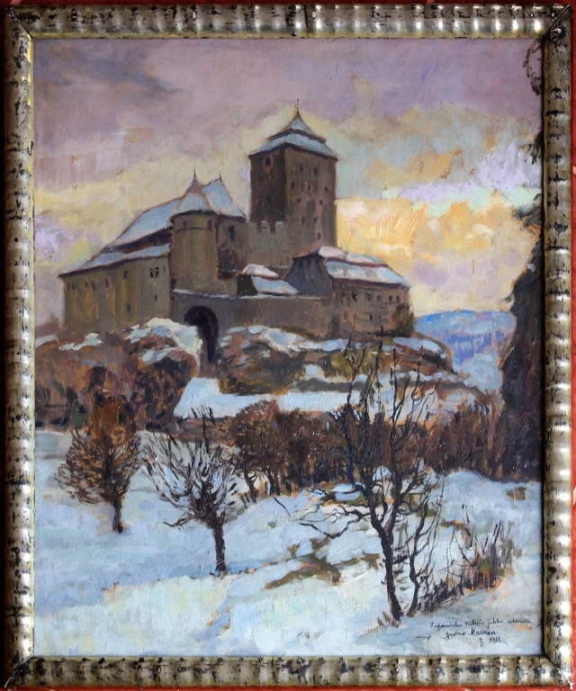HRAD KOSTMacoun GustavOlej na kartoně signovaný vpravo dole, tamtéž datace a věnování. Rozměry 46 x 44 cm, rámováno, zaskleno, celkové rozměry 51 x 49 cm.